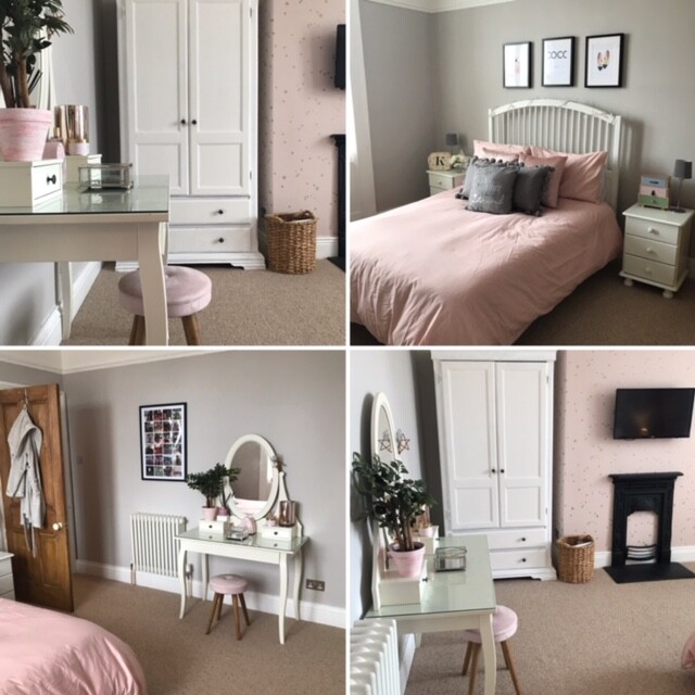 For the design of this room, although it looks like a fair bit of blush pink it's actually mainly in the accessories with the exception being the feature wall.