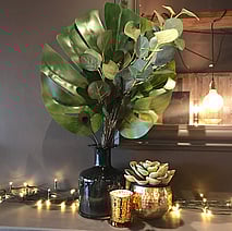 The new shelf was accessorised with fairy lights, the colourful vases with palm leaves and peacock feathers and brass candle holders were added to create more ambience.